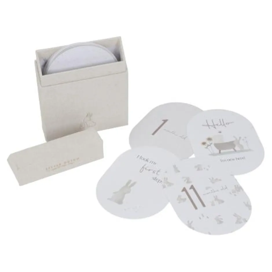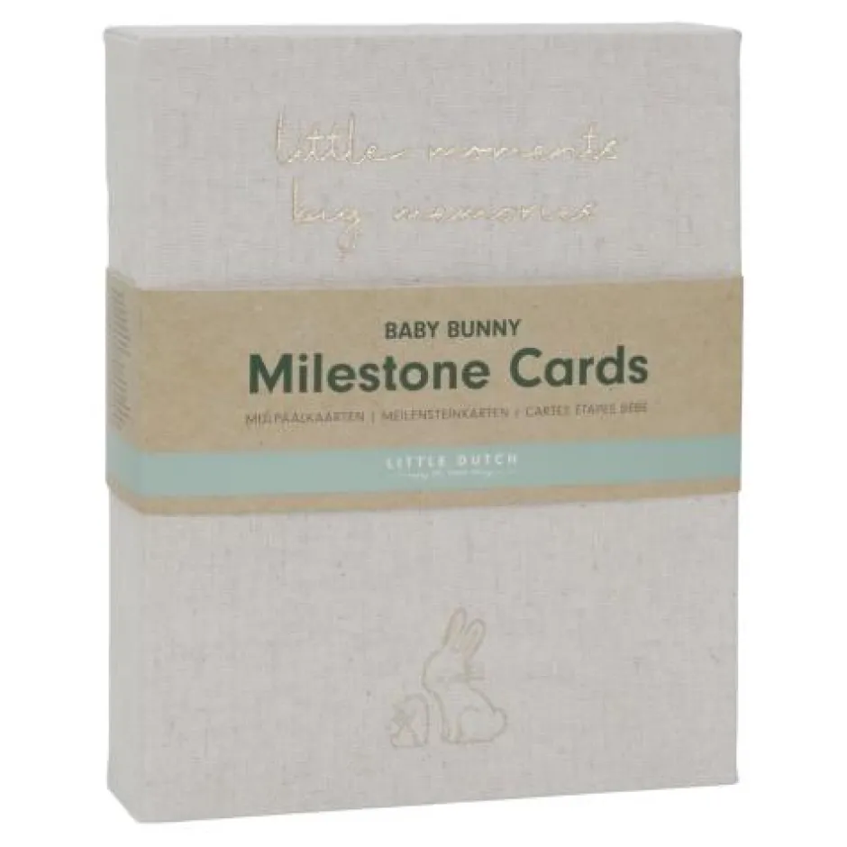 De mijlpaalkaarten worden bewaard in een prachtig lichtbeige doosje, versierd met luxe linnen stof. Het doosje is gedecoreerd met de tekst ‘Little moments, big memories’ en het betoverende Baby Bunny ontwerp dat ook de mijlpaalkaarten siert. Het is de perfecte plek voor de onvergetelijke momenten van je kleine engeltje, waardoor het een schatkist van herinneringen wordt die een leven lang gekoesterd zullen worden.