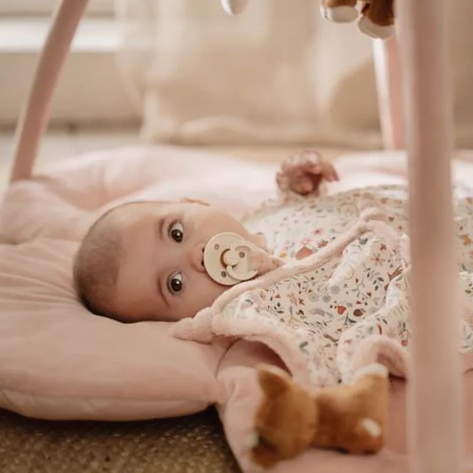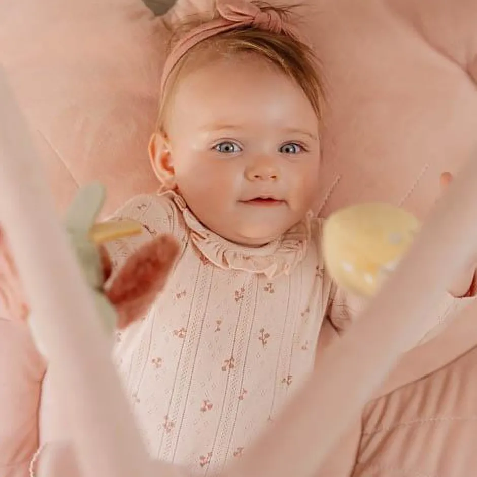 Zoveel te zien, te voelen en te horen! Elke dag is een nieuw avontuur met dit bloemvormige speelkleed. Het roze kleed heeft twee grote corduroy bogen waar vijf verschillende knuffeltjes uit de Fairy Garden collectie aan hangen. Het lieve hertje, de vogel, paddenstoel, bloem en aardbei helpen je kindje bij het ontwikkelen van sensorische vaardigheden en stimuleren de hand-oogcoördinatie. WAARSCHUWING: Om te voorkomen dat het kind verstrikt raakt, en zich bezeert, verwijder dit speelgoed wanneer het kind op handen en voeten begint te kruipen. Te monteren door een volwassene.