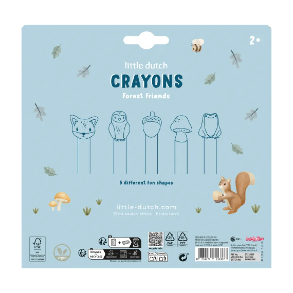 Tijd om samen de wereld van kleur te ontdekken! Met deze vrolijke waskrijtjes in de vorm van bosvriendjes maakt jouw kleintje de mooiste kunstwerken. Een vosje, een uiltje, een paddestoel… stuk voor stuk figuren om van te houden. De krijtjes zijn makkelijk vast te houden voor kleine handjes en stimuleren de fijne motoriek tijdens het spelen.