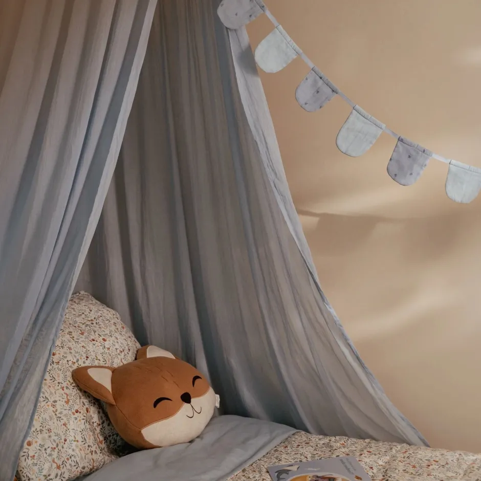 Fleur de baby- of kinderkamer op met deze mooie slinger van ronde vlaggetjes. Wie zegt dat slingers alleen voor feestjes zijn! Ze fleuren een kamer meteen op. Aan de muur, rond de klamboe, op een boekenplank of om een speeltent te versieren. Ga creatief aan de slag met deze charmante slinger van mousseline in de zachte kleur ‘Pure Denim Blue’.