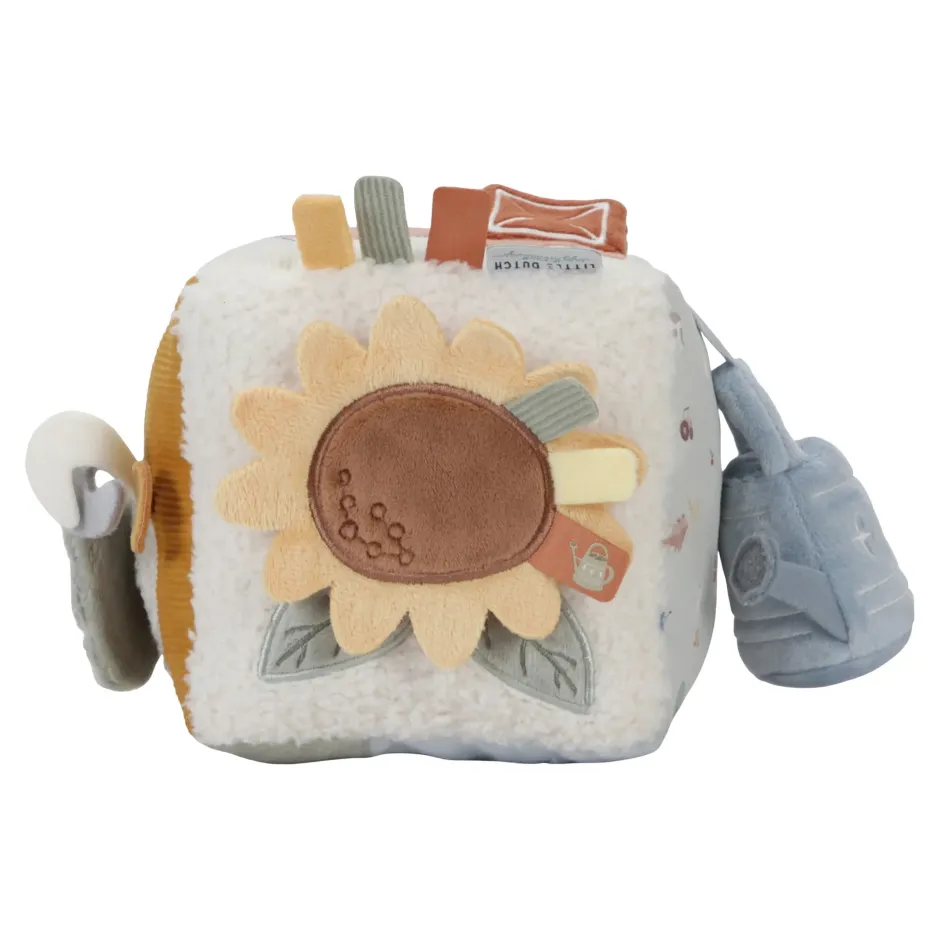 Op avontuur op de boerderij. Deze superzachte activiteitenkubus in zachte tinten wekt de nieuwsgierigheid van jouw kleintje zeker. Elke zijde is voorzien van een andere activiteit met verschillende texturen en vormen die helpen bij het ontwikkelen van de zintuigen en natuurlijk voor eindeloos veel entertainment zorgen. De kubus kan vastgepakt en gedraaid worden en beschikt over een spiegeltje voor zelfontdekking.