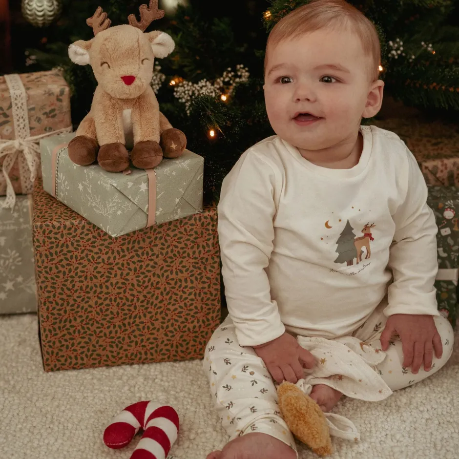 Dit schattige kerstcadeau voor baby’s bevat drie zachte producten: een knuffeldoekje met ster, een rammelaar in de vorm van een zuurstok en een lieve rendierknuffel.