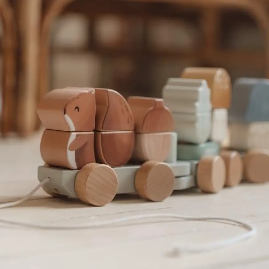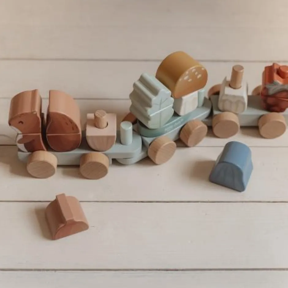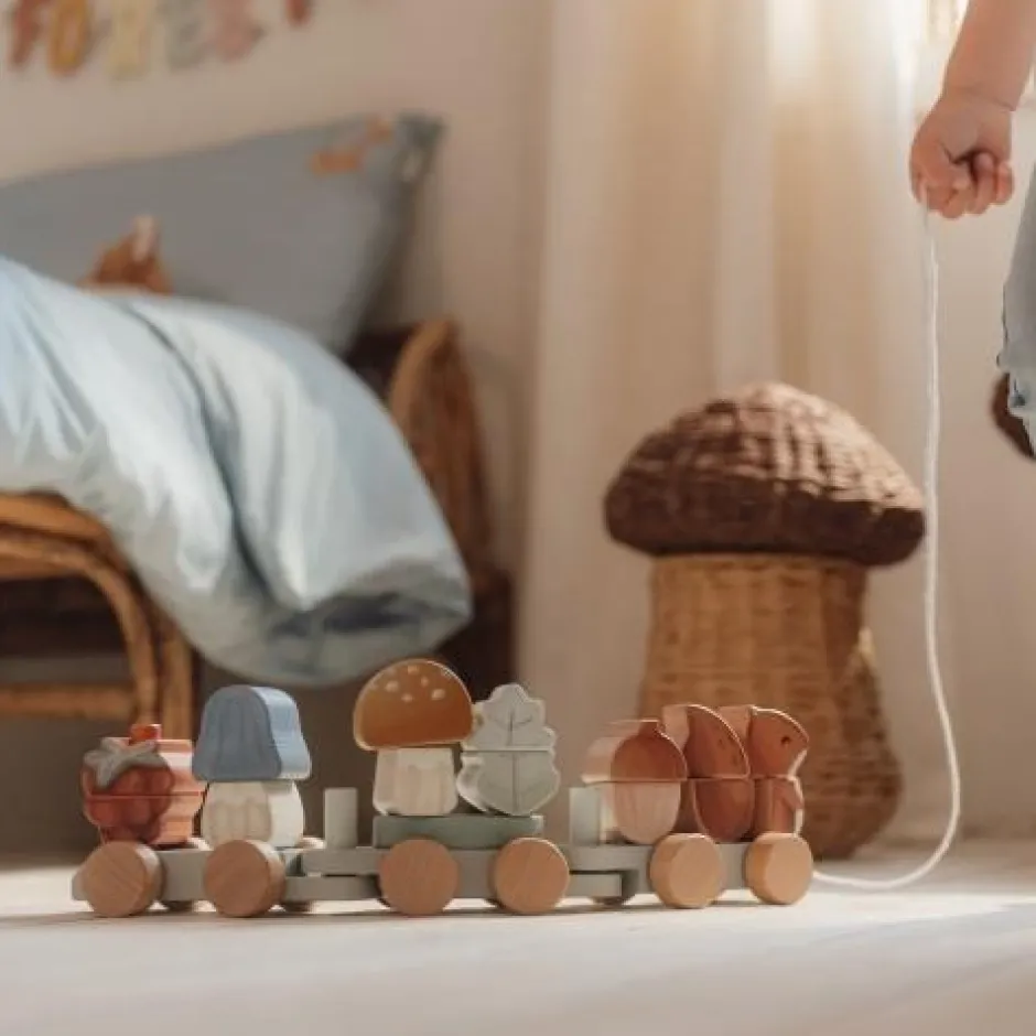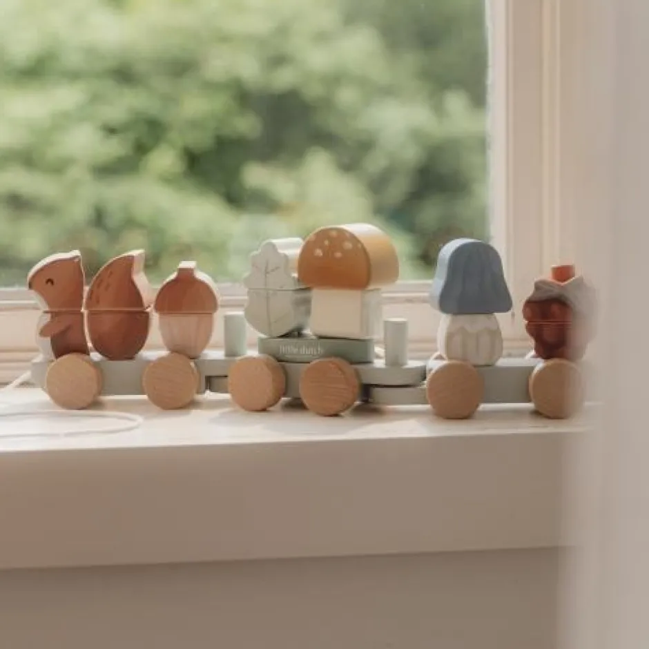 Choo choo! Verzamel alle lieve diertjes, paddenstoelen en schatten uit het bos en spring aan boord voor een magische reis. Stapel de blokken één voor één op de drie wagons van deze houten stapeltrein en ga op reis met de vriendjes van Forest Friends. De eekhoorn neemt het voortouw en zit vooraan. Welke paddenstoel volgt en waar hoort de dennenappel? Elk blok vormt een stukje van het verhaal van jouw verbeelding. Een leuke manier om te spelen en tegelijkertijd de hand-oogcoördinatie te ontwikkelen. De trein bestaat uit 18 onderdelen en is ongeveer 45 cm lang.