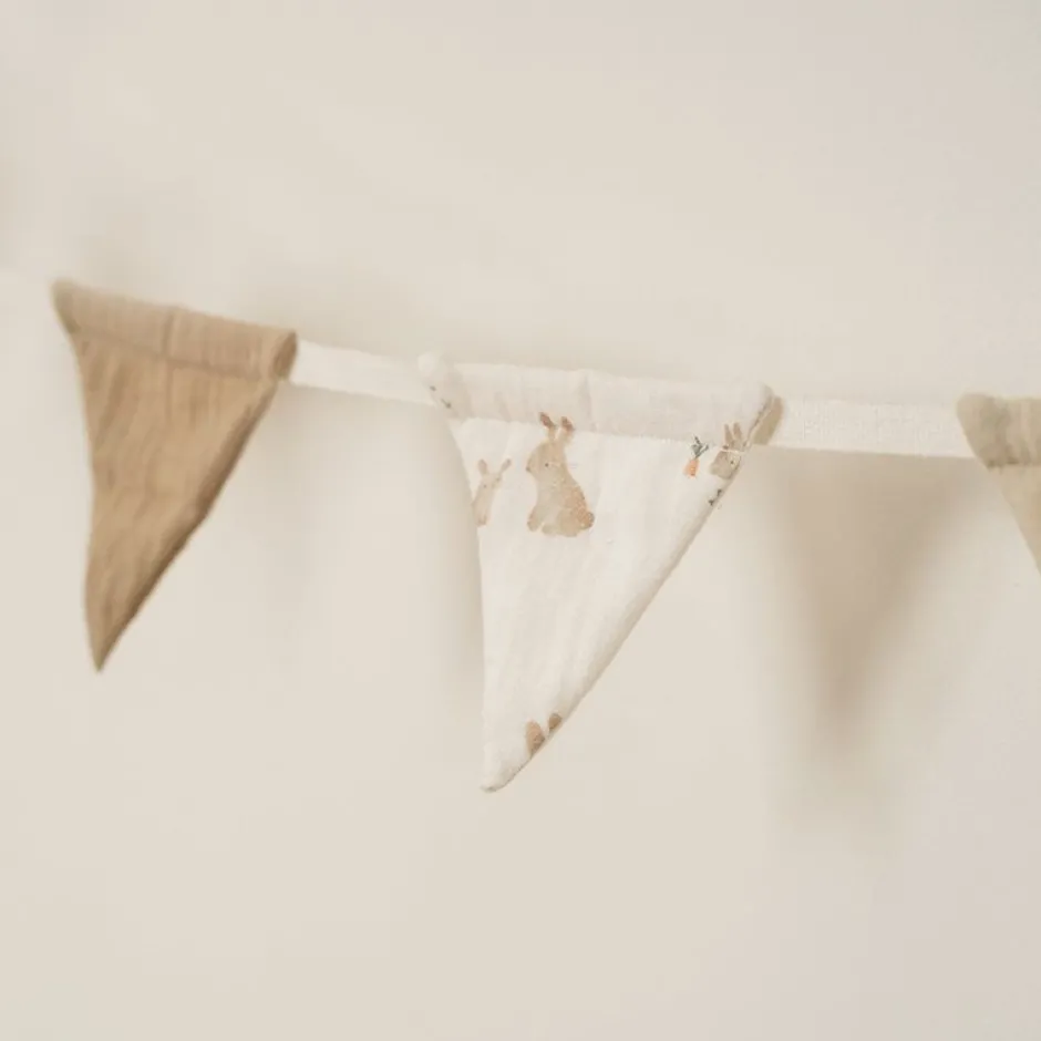 Vrolijk de babykamer op met deze mooie slinger van vlaggetjes. Wie zegt dat slingers alleen voor feestjes zijn?! Ze fleuren een kamer meteen op. Aan de muur, om de klamboe, op een boekenplank of ter versiering van een speeltent. Ga creatief aan de slag met deze charmante stoffen slinger in zachte kleuren. De slinger is gemaakt van 100% biologisch katoen en heeft een lengte van 200 cm.