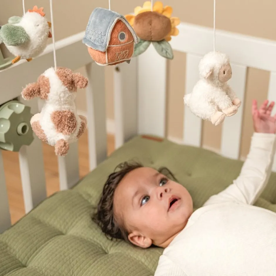 Deze mooie Little Dutch muziekmobiel werkt rustgevend voor baby’s dankzij het lieve slaapliedje. Aan de mobiel hangen vijf speeltjes uit de Little Farm collectie. Baby’s kijken graag naar de beweging van deze speeltjes, wat hun visuele ontwikkeling stimuleert. De muziekmobiel is geschikt vanaf de geboorte en eenvoudig te bevestigen aan het kinderbed of de box. WAARSCHUWING: Bevestig dit speelgoed buiten bereik van het kind. Om te voorkomen dat het kind verstrikt raakt, en zich bezeert, verwijder dit speelgoed wanneer het kind op handen en voeten begint te kruipen. Te monteren door een volwassene.