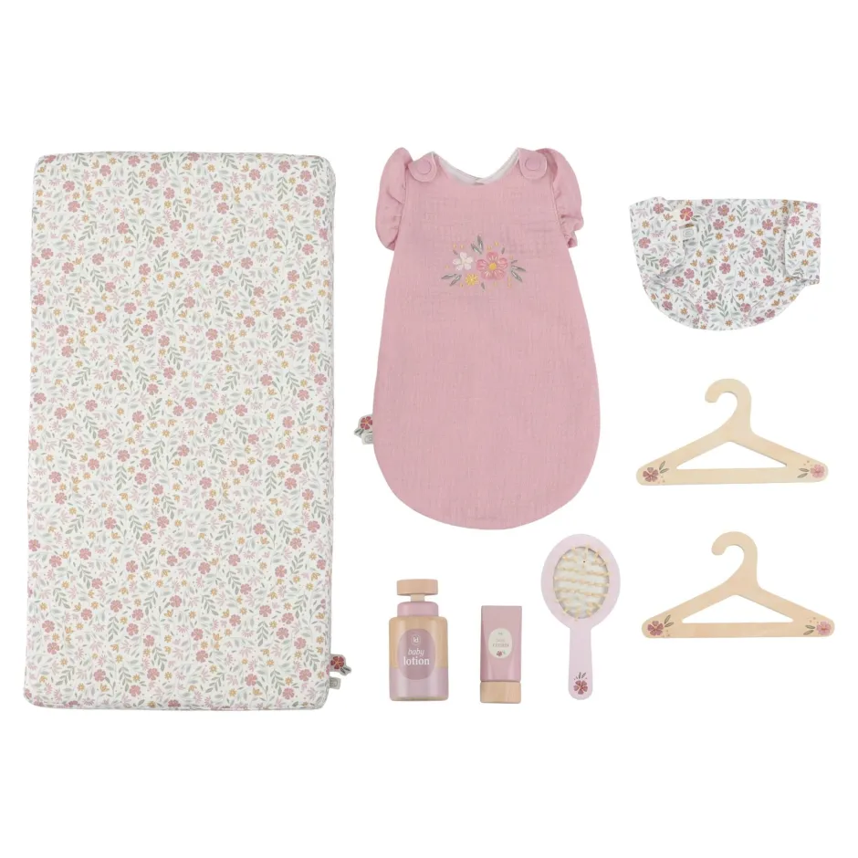 Deze prachtige poppencommode biedt alles wat je nodig hebt om je pop liefdevol te verzorgen. De set is inclusief een mobiel, een heerlijk zacht aankleedkussen met het dromerige Soft Flowers-dessin en diverse houten verzorgingsaccessoires. Daarnaast bevat de commode een luier, een slaapzak en schattige kledinghangers om de outfits van je pop netjes op te bergen. Het kastje biedt extra opbergruimte voor alle benodigdheden, zodat je pop altijd goed verzorgd wordt.
