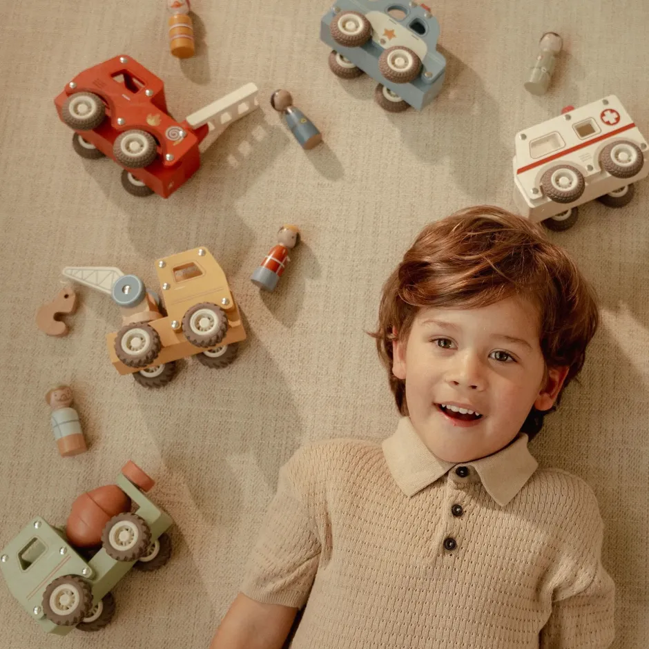 Met deze houten brandweerwagen ben je altijd klaar om in actie te komen. De auto is uitgerust met een uitschuifbare ladder en wordt geleverd met een stoere pegdoll-brandweerman. De stevige houten constructie en rubberen wielen zorgen voor soepele ritjes door de hele kamer. Dankzij het open ontwerp kunnen kinderen de brandweerwagen makkelijk vasthouden en duwen. Perfect voor fantasierijk spel en spannende reddingsmissies.