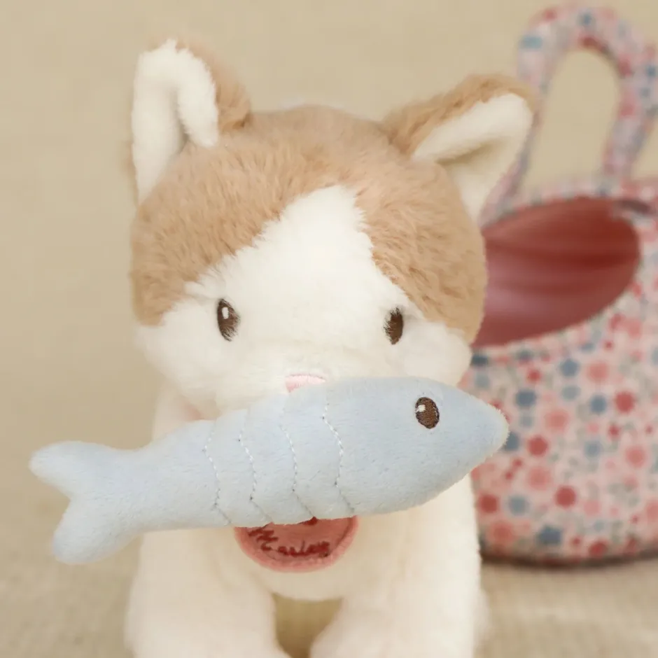 Voor de kleine kattenfans is er deze knuffelige poes Marley in een prachtige bloemenprint tas. Met haar zachte vachtje en schattige halsbandje wordt ze gegarandeerd een geliefd vriendje. De tas heeft een opening aan de voorkant, zodat het kattenkopje gezellig naar buiten kan gluren. En natuurlijk hoort er ook een speelgoedvisje bij – want spelen en knuffelen, daar houdt deze kat het allermeest van!