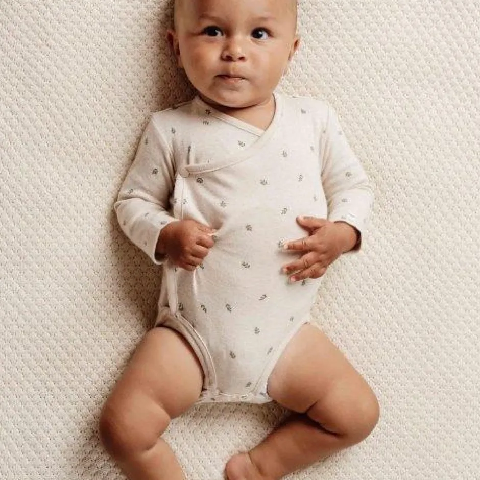 Gehuld in comfort! Dit rompertje met een overslag sluiting en drukknoopjes is de perfecte basis voor de eerste avonturen van jouw pasgeborene. De charmante zandkleur met een fijn printje van kleine blaadjes zorgt voor een natuurlijke uitstraling. Gemaakt van zacht biologisch katoen en met praktische drukknoopjes bij het kruis, biedt dit rompertje een nauwsluitende en comfortabele pasvorm, ideaal voor dagelijks gebruik. Het overslagontwerp maakt het aan- en uitkleden heel gemakkelijk, wat zowel voor jou als je baby handig is. Het rompertje combineert prachtig met elk item uit de Little Farm-collectie. Verkrijgbaar in maten 44, 50, 56, 62, 68 en 74.