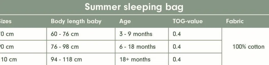 | Waarschuwing | WAARSCHUWING! Niet gebruiken als het hoofd van het kindje door de halsopening kan schuiven. Zorg dat de hals- en mouwopeningen goed gesloten zijn. Niet gebruiken als het kind uit het bed kan klimmen. Niet in combinatie met een dekbed of deken gebruiken. Houd rekening met de kamertemperatuur en de slaapkleding van het kind. Oververhitting kan het leven van het kind in gevaar brengen! Stop met gebruik van de slaapzak als deze beschadigd is. Uit de buurt van vuur houden. Onderhoudsinstructies conform EN ISO 3758. Niet professioneel droogreinigen. |
