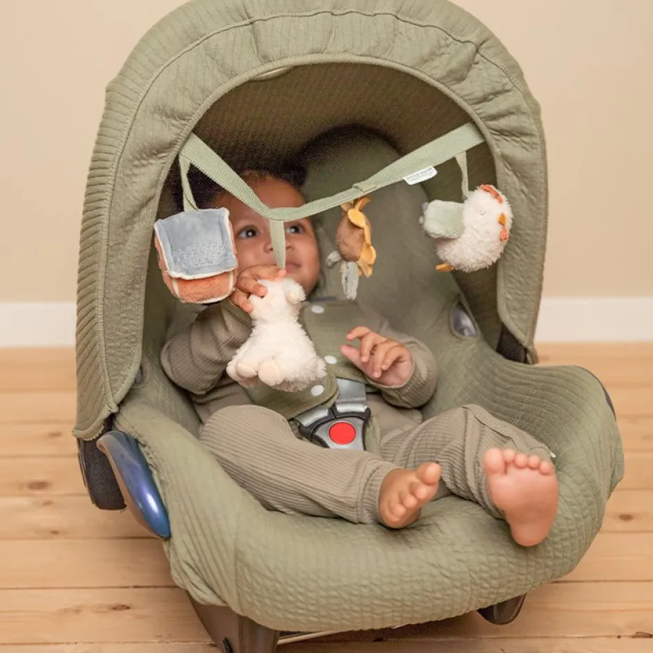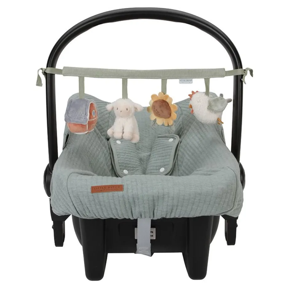 Deze Little Dutch wagenspanner met de vriendjes van de boerderij is eenvoudig te bevestigen aan een autostoeltje of kinderwagen en zorgt onderweg voor veel speelplezier en vermaak dankzij de speeltjes met een rammelaar, spiegeltje, knijptoetertje en knisper. Stimuleert tevens de hand-oogcoördinatie. WAARSCHUWING: Om te voorkomen dat het kind verstrikt raakt, en zich bezeert, verwijder dit speelgoed wanneer het kind op handen en voeten begint te kruipen. Te monteren door een volwassene.