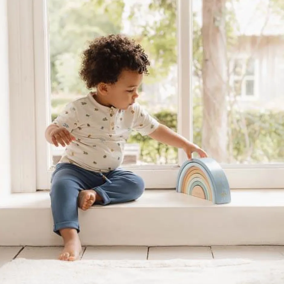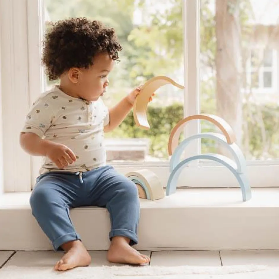 Stapel, sorteer en bouw! Met deze regenboogstapelaar in de tinten blauw, geel en groen zijn er talloze creatieve manieren om te spelen. Gebruik hem niet alleen om een regenboog te bouwen, maar ook om sculpturen te maken of tunnels te creëren voor treinen en auto’s. Laat je fantasie de vrije loop en ontdek eindeloze ideeën om met de bogen te spelen. Deze houten regenboogstapelaar stimuleert fantasierijk spel en bevordert de fijne motoriek. Je zult versteld staan van de veelzijdigheid van dit speelgoed én hoe prachtig het staat in de kinderkamer.