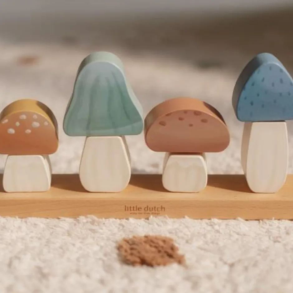 Laten we samen een bos van paddenstoelen bouwen! Mix en match de blokken en maak een rij van vier betoverende paddenstoelen uit de Forest Friends-collectie. Plaats de blokken één voor één op de houder en oefen je hand-oogcoördinatie. Een leuke een leerzame stapelaar die ook mooi staat als decoratie in de kinderkamer.
