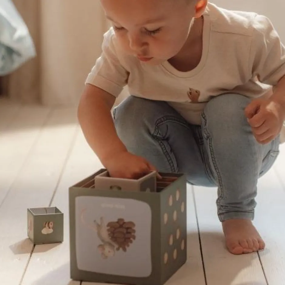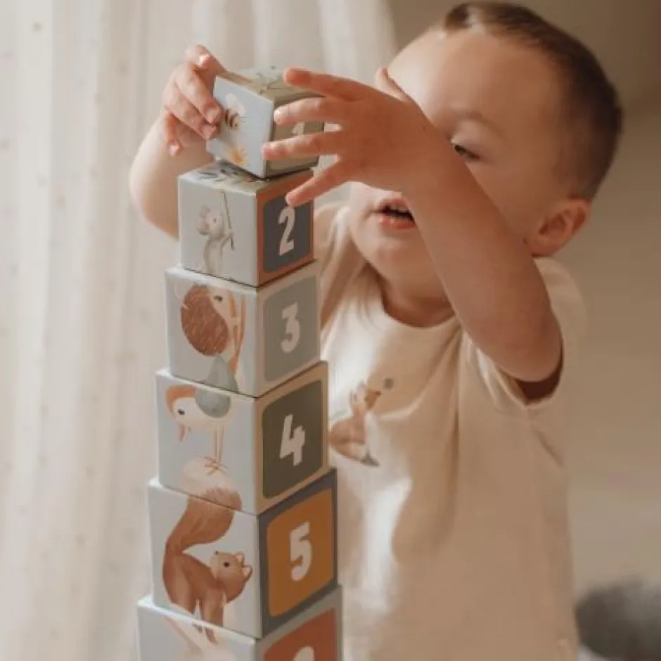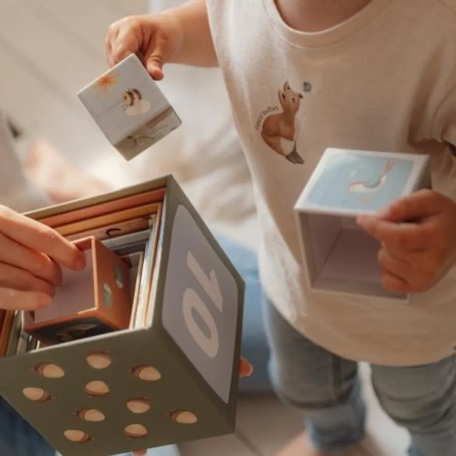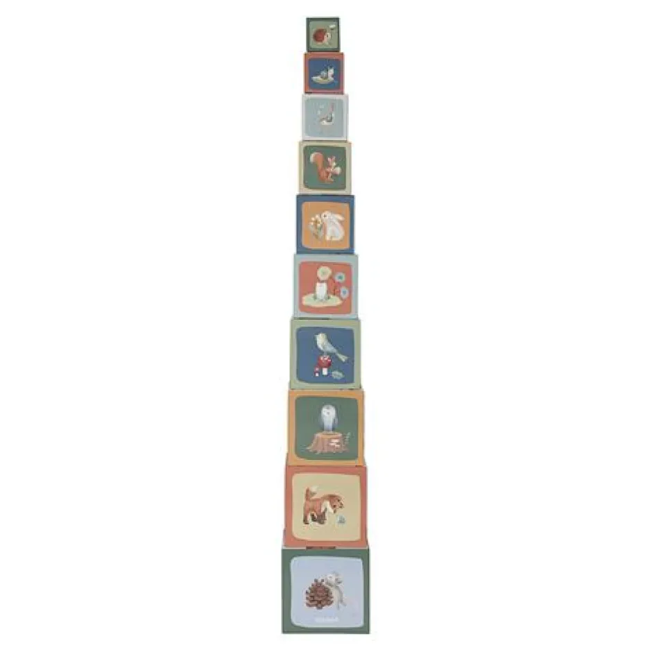 Stapel het ene blok op het andere en zie de magie van Forest Friends groeien! Je kunt de blokken op elkaar stapelen om een hoge toren te maken of ze horizontaal op de grond leggen. Ontdek vier betoverende taferelen terwijl je bouwt. Plaats het ene dier op het andere, van groot naar klein. Sorteer ze op twee manieren door te tellen, of verzamel alle afbeeldingen uit het betoverende bos. Kinderen leren spelenderwijs tot 10 te tellen met deze stapelblokken. De blokken zijn voorzien van prachtige illustraties uit de Forest Friends-collectie, waaronder eekhoorns, vossen, konijntjes, egels, uilen en paddenstoelen. Om ze gemakkelijk op te bergen, passen de kleine blokjes in de grotere. Gemaakt van stevig karton, kunnen de blokken tegen een stootje. Het kleinste blokje meet 5 cm en de grootste is 14 cm.