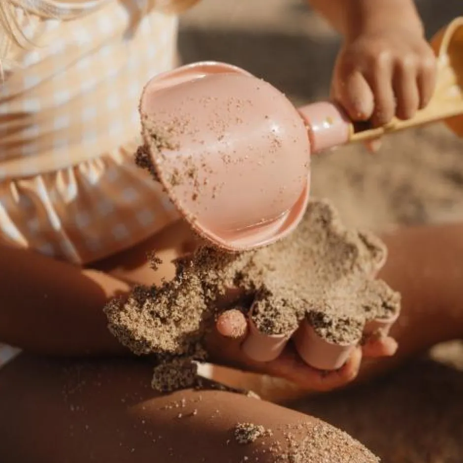 Laten we kunst maken met zand! Met dit schepje en twee vormen kun je al je fantasie gebruiken om prachtige zandkunst te maken op het strand of in de zandbak! Strand speelgoed meenemen is een fijne manier om je kleintje een middag lang geïnteresseerd en bezig te houden. Deze set bevat een schepje en twee zandvormen: een roze bloem en een groene vlinder. Allemaal ontworpen voor kleine handjes om een goede grip en veel plezier met zand te hebben.