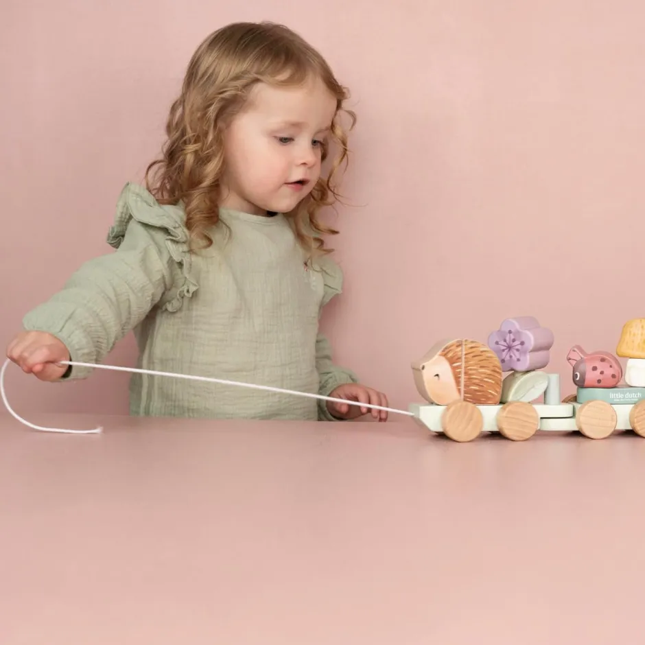 Choo choo! Verzamel alle lieve diertjes, bloemen en schatten uit Fairy Garden en spring aan boord voor een magische reis. Stapel de blokken één voor één op de drie wagons van deze houten stapeltrein. De egel neemt het voortouw en zit vooraan. Welke bloem volgt en waar zit het lieveheersbeestje? Elk blok vormt een stukje van het verhaal van jouw verbeelding. Een leuke manier om te spelen en tegelijkertijd de hand-oogcoördinatie te ontwikkelen. De trein bestaat uit 15 onderdelen en is ongeveer 45 cm lang.
