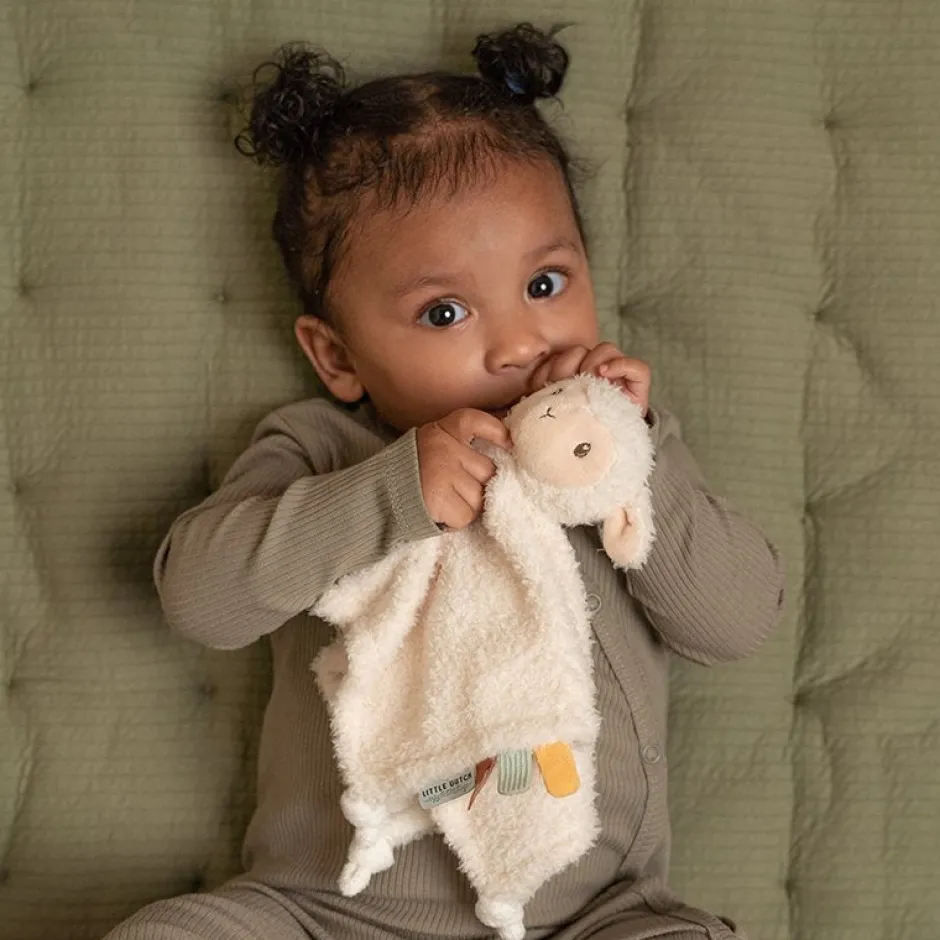 Altijd binnen handbereik. Kindjes hebben dit doekje graag in de buurt. In de box of in de kinderwagen. Deze met een schaapje is afkomstig uit onze Little Farm collectie en biedt vele leuke details om te ontdekken. Denk aan makkelijk vast te pakken leuke labeltjes die de zintuigen prikkelen. De superzachte schaap geeft dit knuffeldoekje een speelse uitstraling.