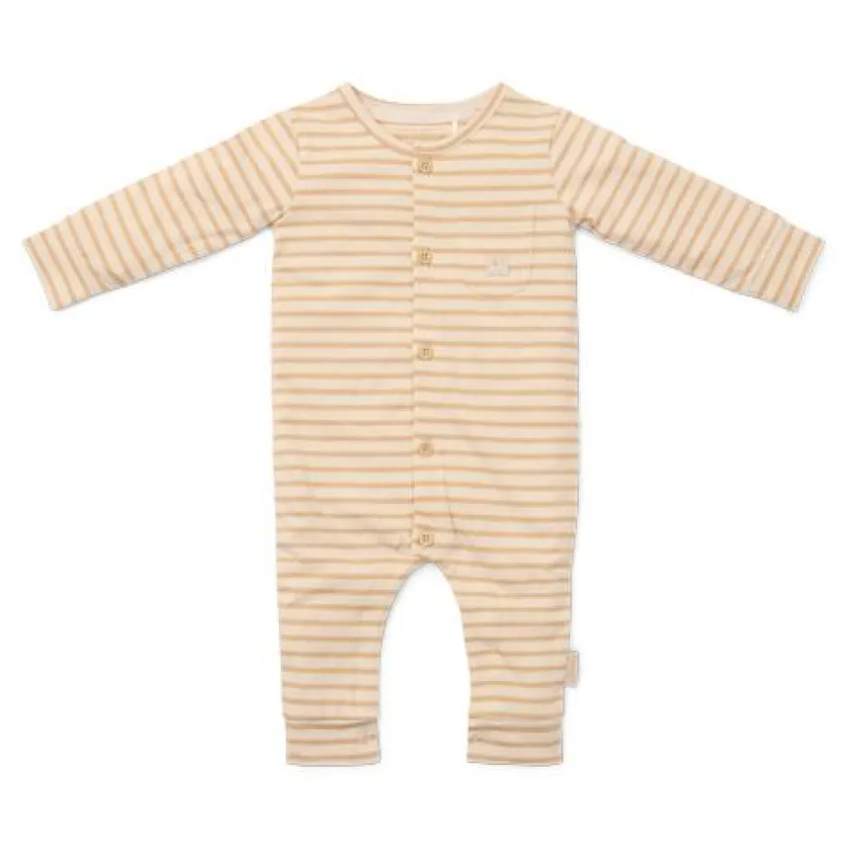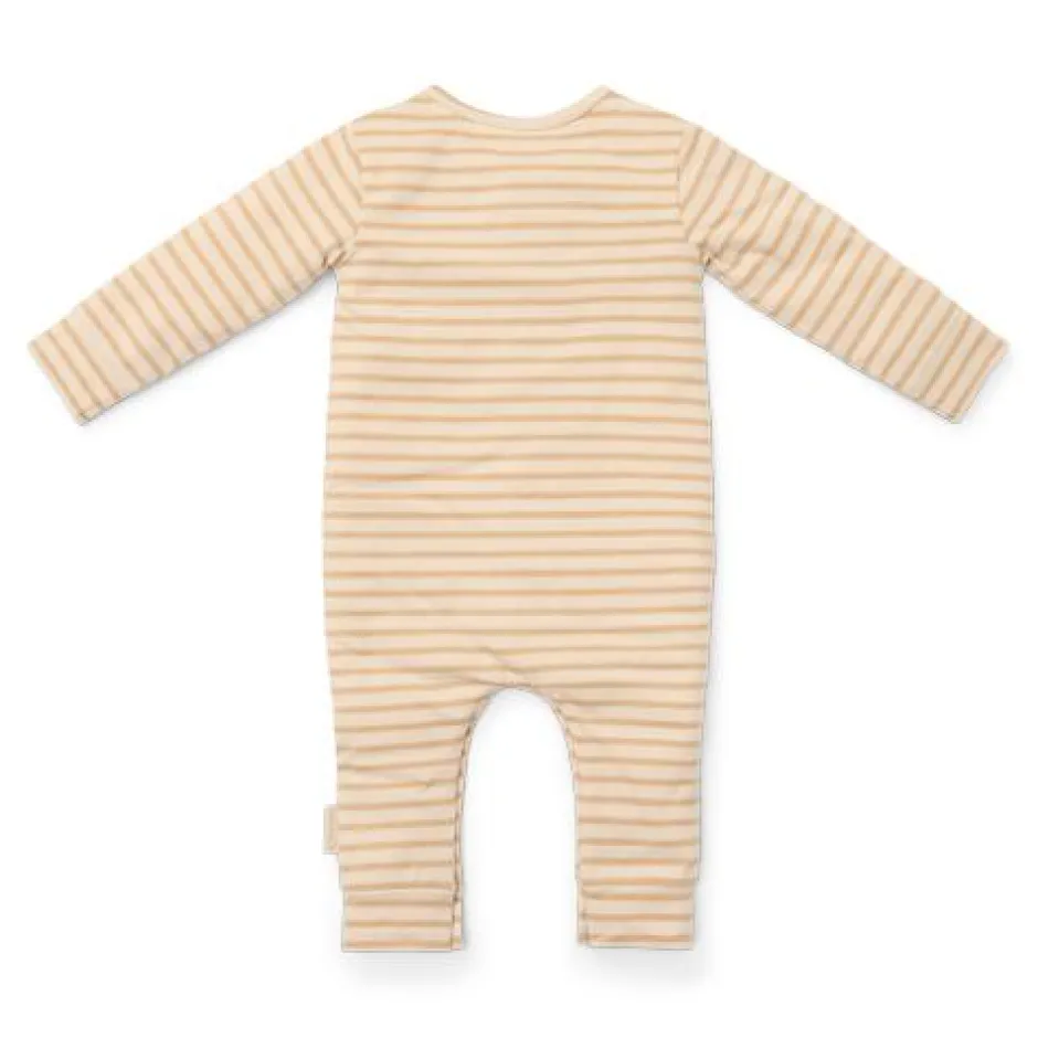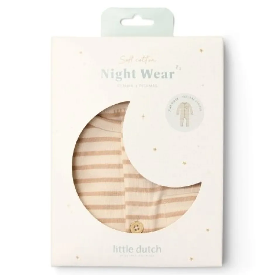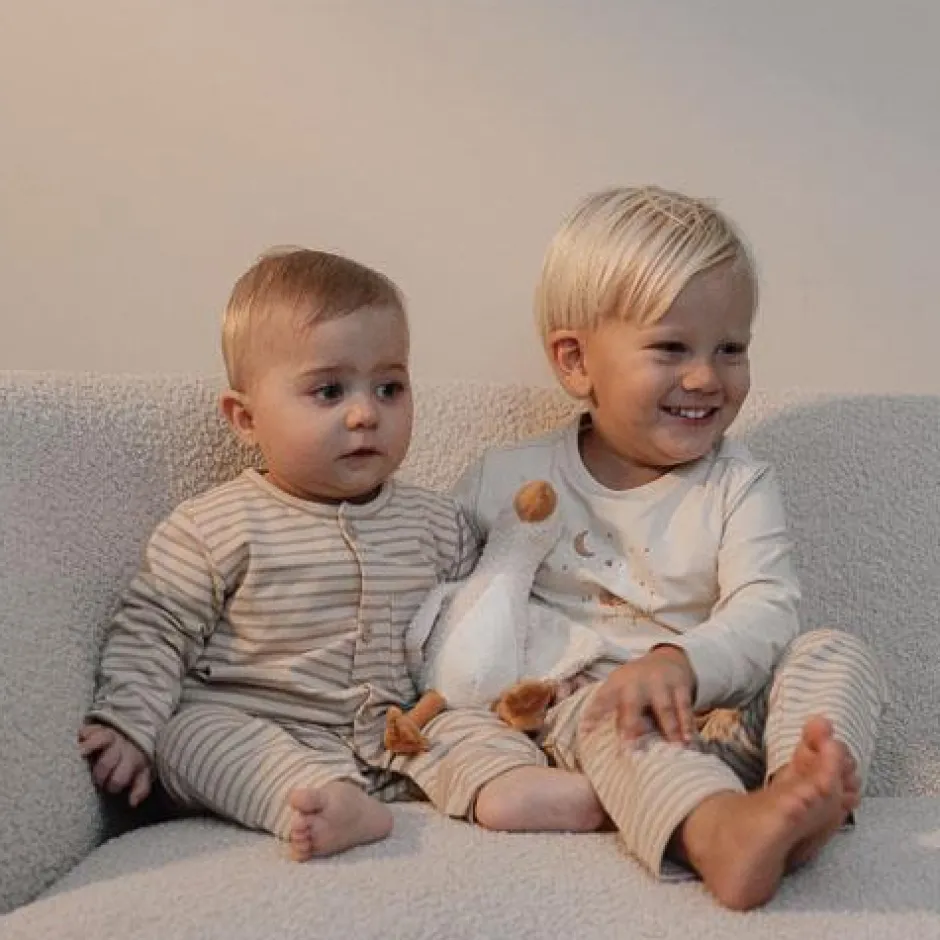 Snooze in streepjes: Dut heerlijk weg in deze zachte gestreepte pyjama’s! Deze onesie heeft een klassiek ontwerp met witte en beige streepjes, en combineert comfort met stijl. De pyjama sluit met hout-look knopen aan de voorkant en drukknoopjes bij het kruis zodat het aan- en uitkleden en het verschonen van luiers heel gemakkelijk is. Gemaakt van biologisch katoen voelt deze pyjama zacht aan op de huid van je baby en staat het perfect bij het bijpassende beddengoed. Verpakt in een mooie doos, dus extra leuk om cadeau te geven. Verkrijgbaar in maten 50/56, 62/68 en 74/80.