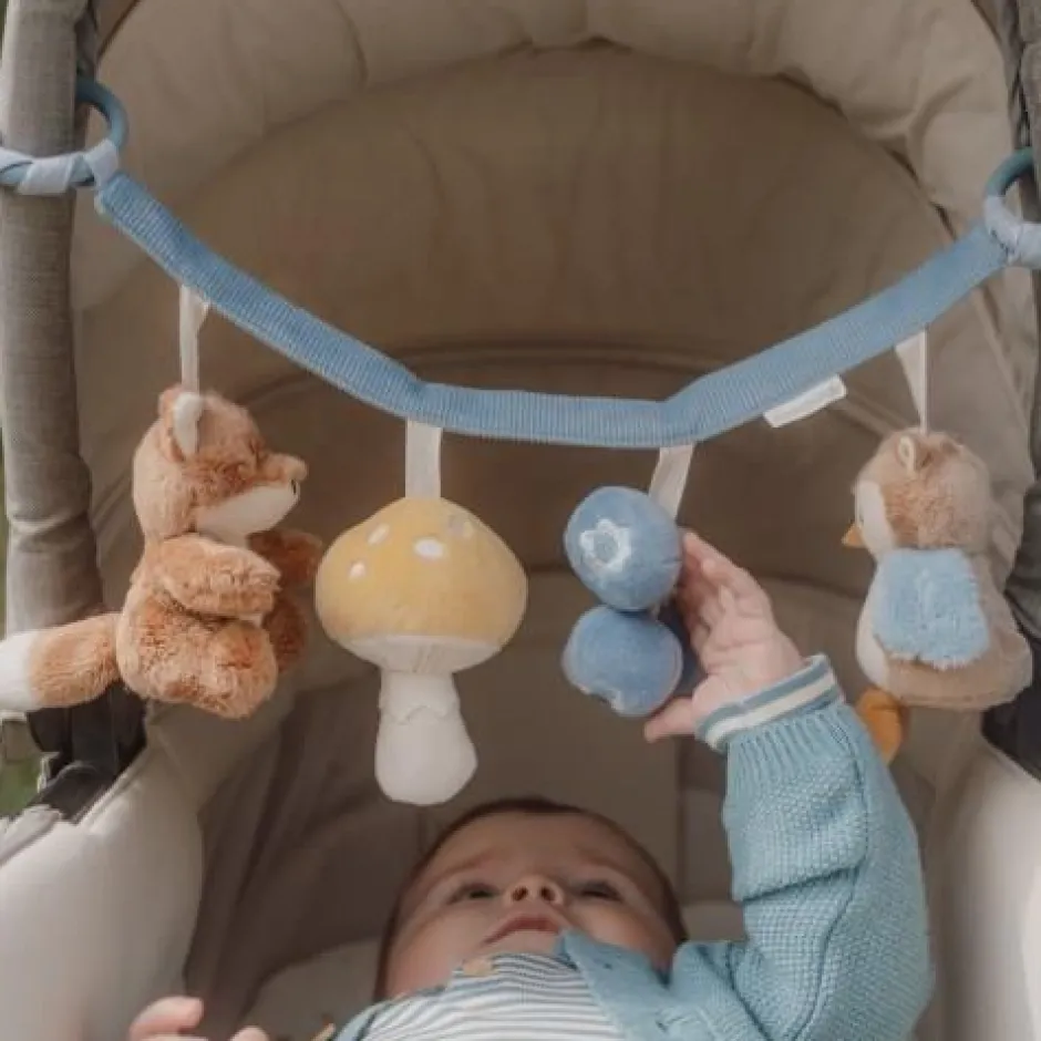 Rammel, piep, knisper. Ontdek de vier schattige speeltjes uit de Forest Friends collectie aan deze wagenspanner. Het lieve vosje, schattige uil, paddenstoel en takje blauwe bessen kunnen niet wachten om je te vermaken tijdens een wandeling. Geef je kindje een zintuiglijke ervaring met deze kleurrijke wagenspanner, die de ontwikkeling van de hand-oogcoördinatie stimuleert terwijl jullie onderweg zijn. Bevestig de wagenspanner eenvoudig aan een kinderwagen. WAARSCHUWING: Om te voorkomen dat het kind verstrikt raakt, en zich bezeert, verwijder dit speelgoed wanneer het kind op handen en voeten begint te kruipen. Te monteren door een volwassene.