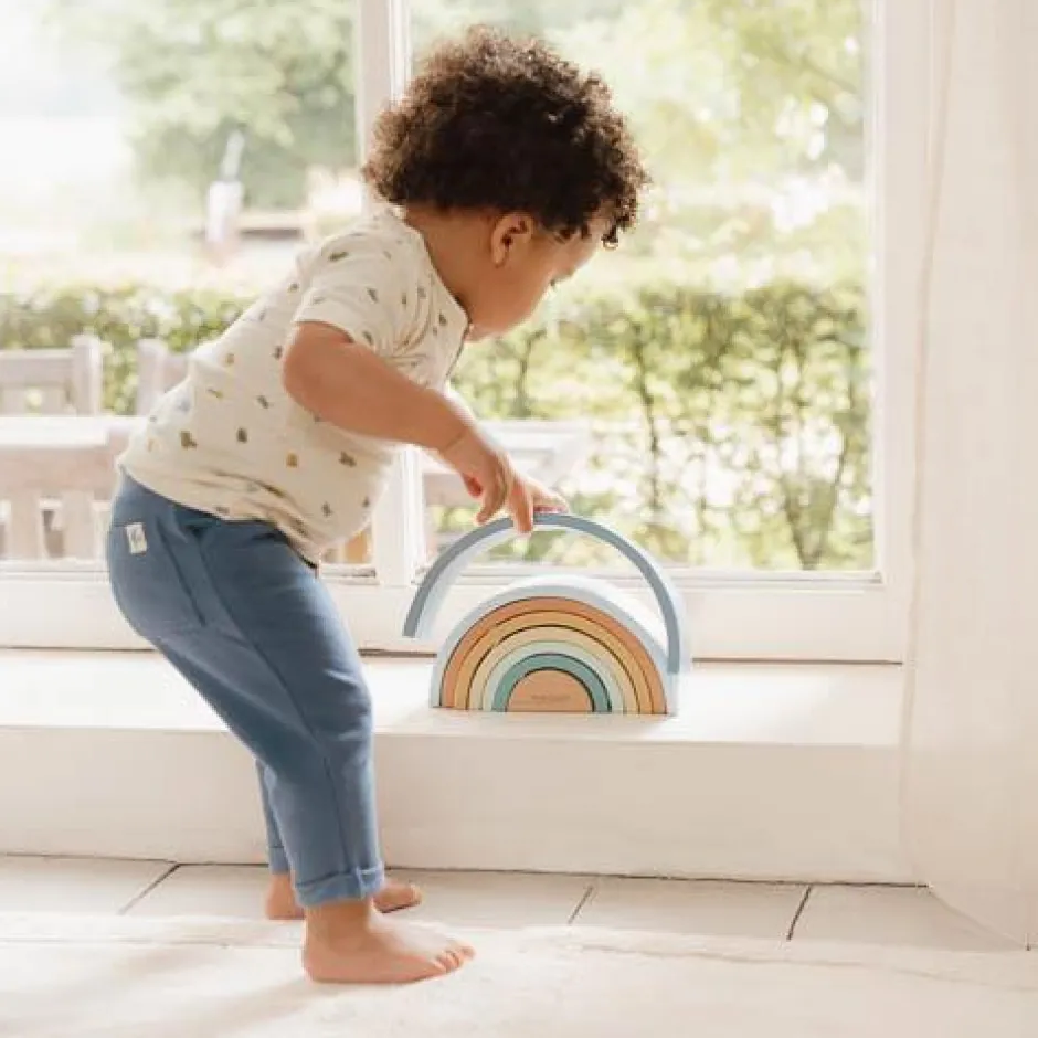 Stapel, sorteer en bouw! Met deze regenboogstapelaar in de tinten blauw, geel en groen zijn er talloze creatieve manieren om te spelen. Gebruik hem niet alleen om een regenboog te bouwen, maar ook om sculpturen te maken of tunnels te creëren voor treinen en auto’s. Laat je fantasie de vrije loop en ontdek eindeloze ideeën om met de bogen te spelen. Deze houten regenboogstapelaar stimuleert fantasierijk spel en bevordert de fijne motoriek. Je zult versteld staan van de veelzijdigheid van dit speelgoed én hoe prachtig het staat in de kinderkamer.