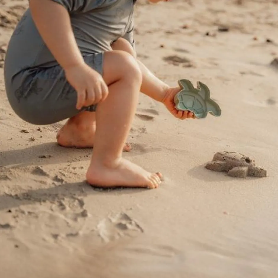 Laten we kunst maken met zand! Met dit schepje en twee vormen kun je al je fantasie gebruiken om prachtige zandkunst te maken op het strand of in de zandbak! Strand speelgoed meenemen is een fijne manier om je kleintje een middag lang geïnteresseerd en bezig te houden. Deze set bevat een schepje en twee zandvormen: een groene schildpad en blauwe zeilboot. Allemaal ontworpen voor kleine handjes om een goede grip en veel plezier met zand te hebben.