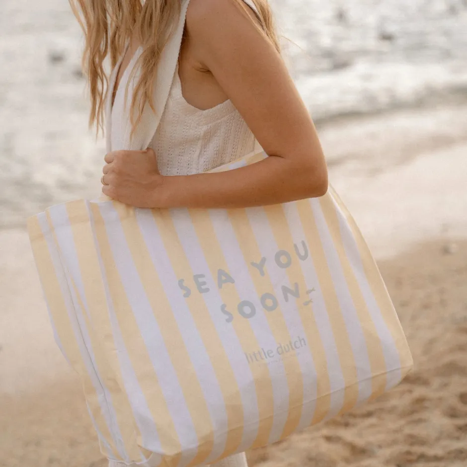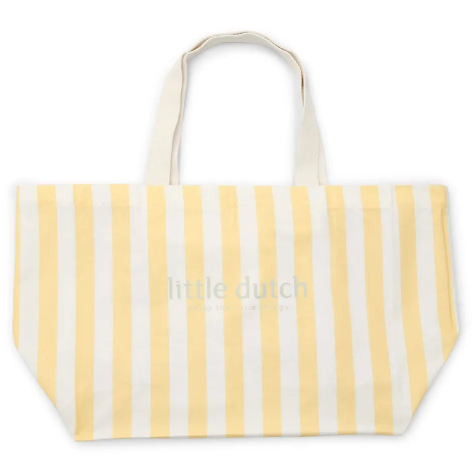 Mama kan alles meenemen in deze bijpassende canvas strandtas van 100% katoen. Uitgevoerd in een fijn zonnig geel streepje uit de collectie, straalt deze tas zomerse vrolijkheid uit. Binnenin zit een handig vakje met rits, perfect voor het veilig opbergen van je portemonnee en autosleutels. Ideaal voor een dagje strand of zwembad, waar stijl en functionaliteit samenkomen.