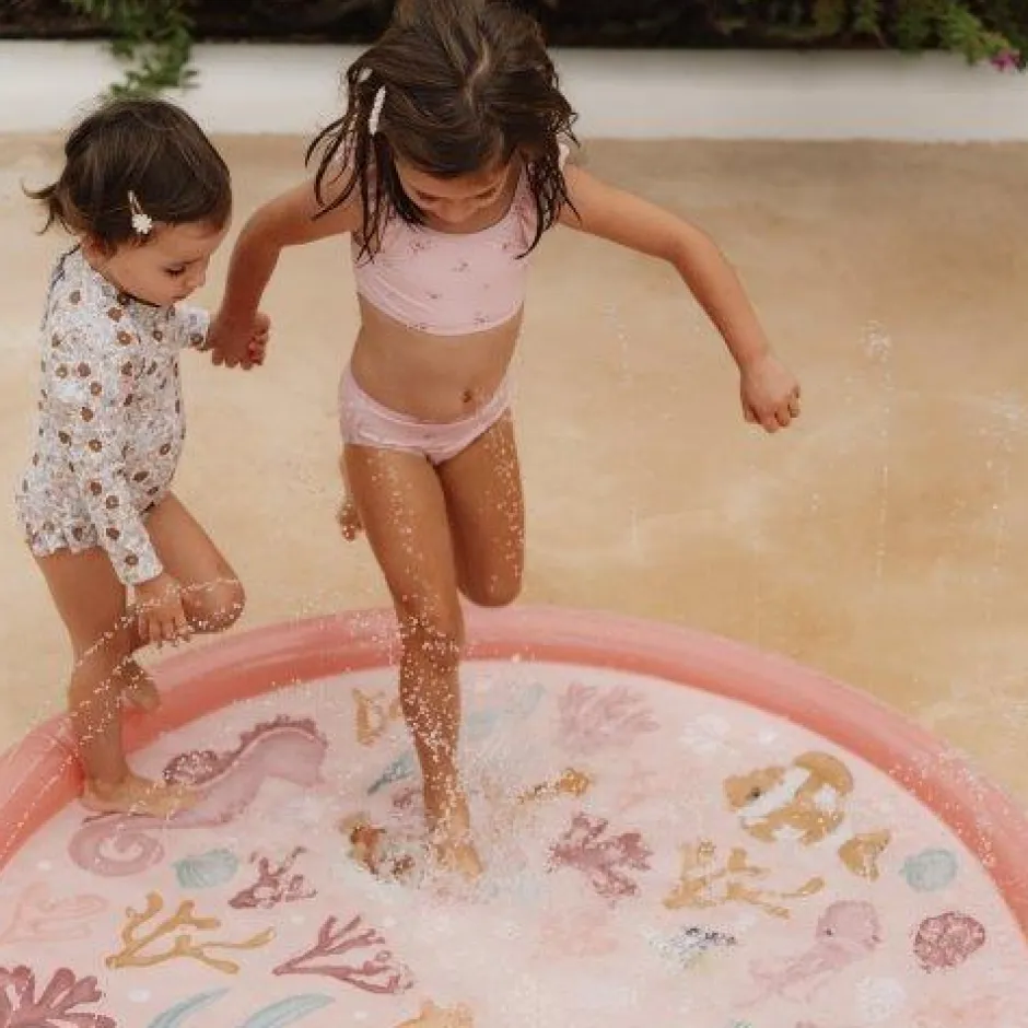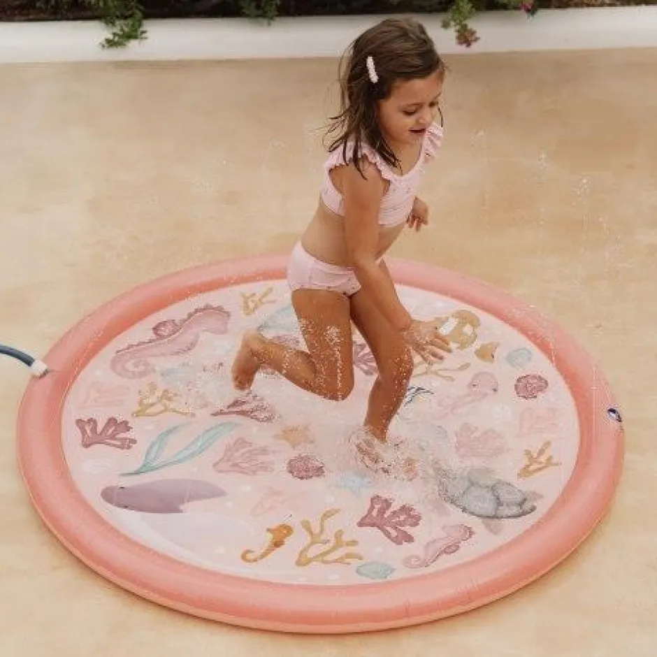 Sproei en spetter! Op warme zomerdagen houdt deze waterspeelmat je lekker koel, en bezig. Loop dwars door de fontein, ga in het midden zitten, nodig je vrienden uit en speel er om- en door heen, of probeer de waterstralen op te vangen met je handen! Spelen met water was nog nooit zo leuk! Deze roze waterspeelmat is versierd met alle figuren die je in Ocean Dreams Pink kunt vinden. Draai de sproeier eenvoudig aan je tuinslang en je kleintje zal eindeloos genieten van alle waterpret.